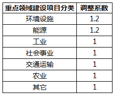 在上述基準收費標準的基礎上,根據《關于深入開展終點建設項目社會穩定風險評估工作的通知》(滬發改投[2011]169號)對重點領域建設項目的劃分,按照下表的具體劃分標準乘以相應的調整系數,進行調整: