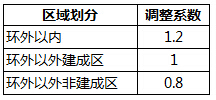 在上述收費標準的基礎上,根據項目所在區域所處地理位置以及是否為建成區劃分,按照下表的具體劃分標準乘以相應的調整系數,進行調整: